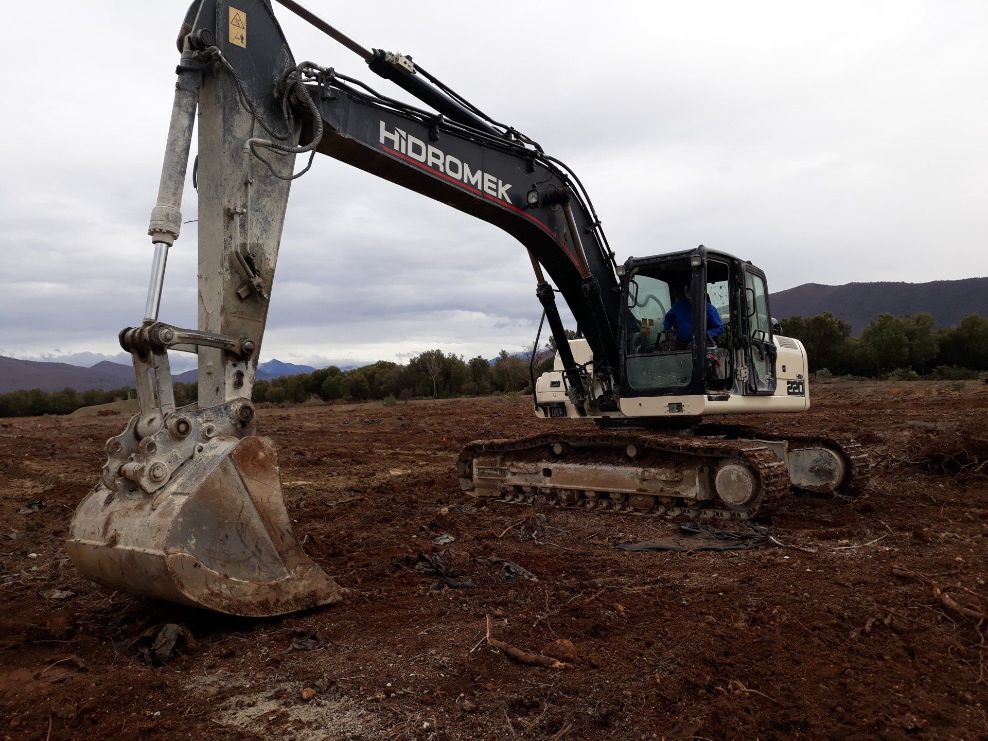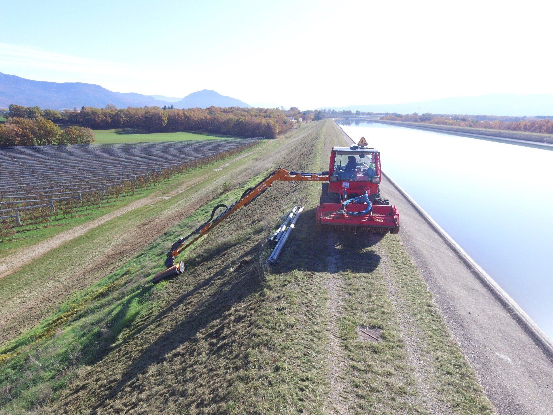 avec bras NOREMAT longueur 10 mètres équipé d’un broyeur forestier à marteaux : idéal pour traiter les bordures de pistes forestières